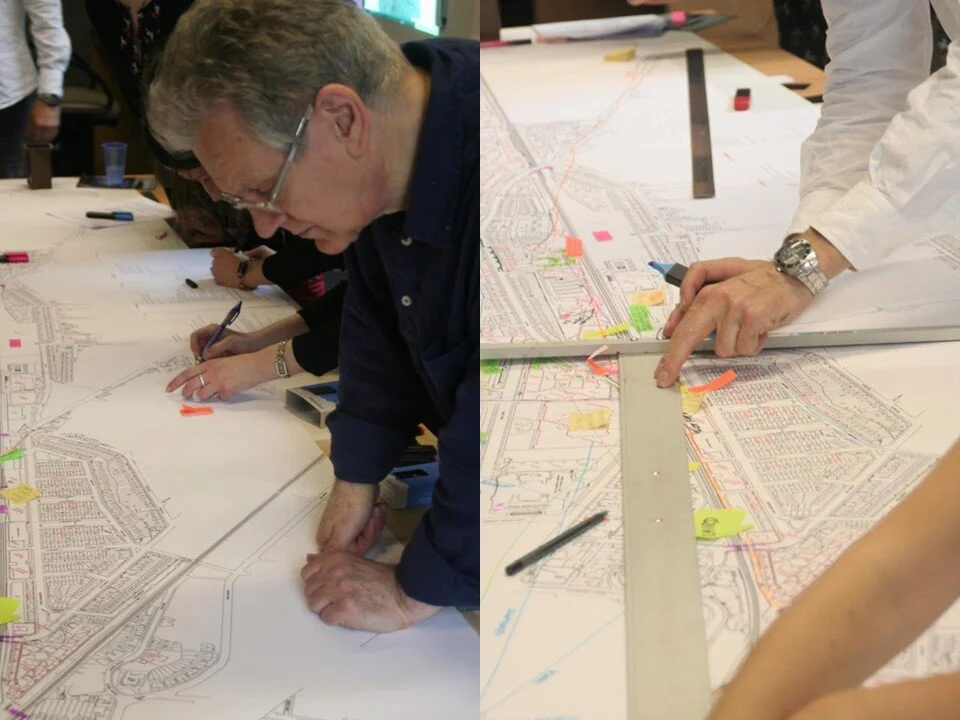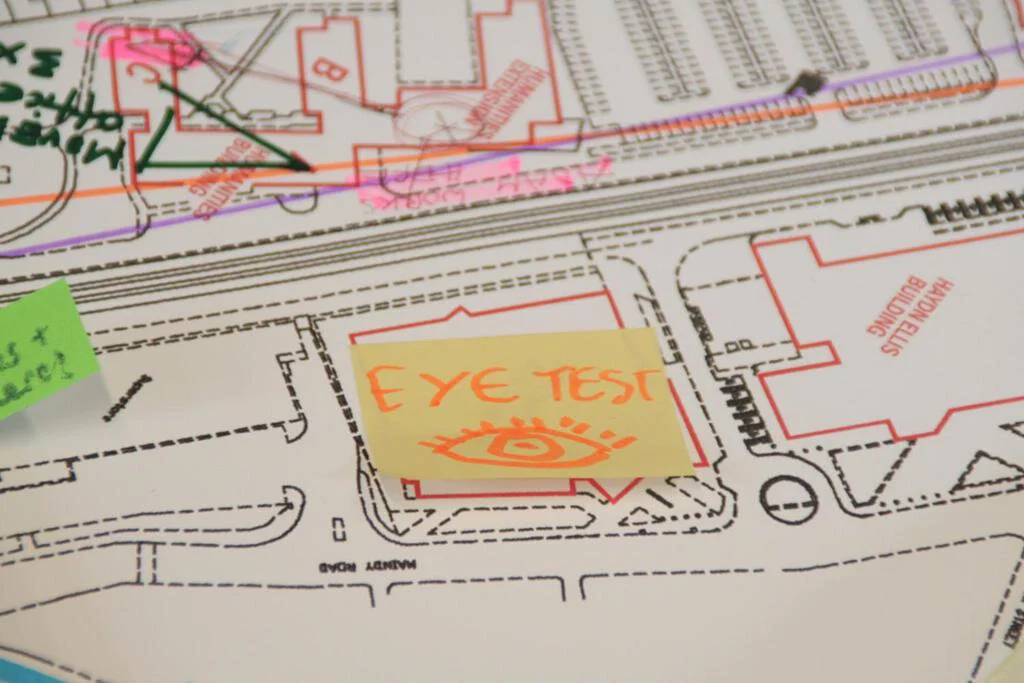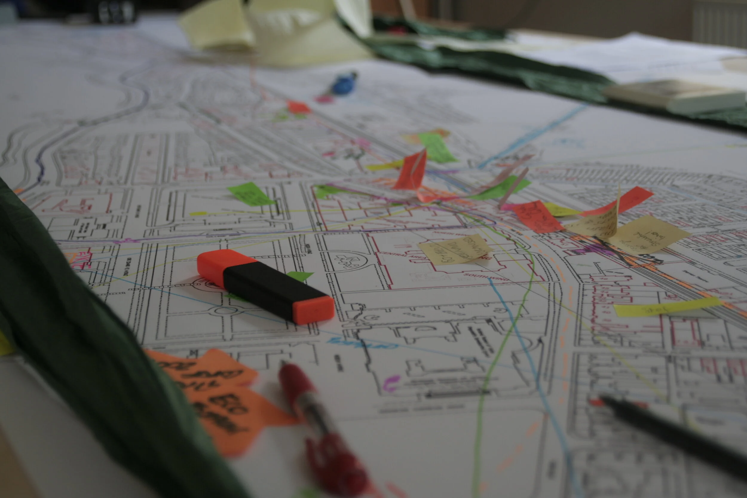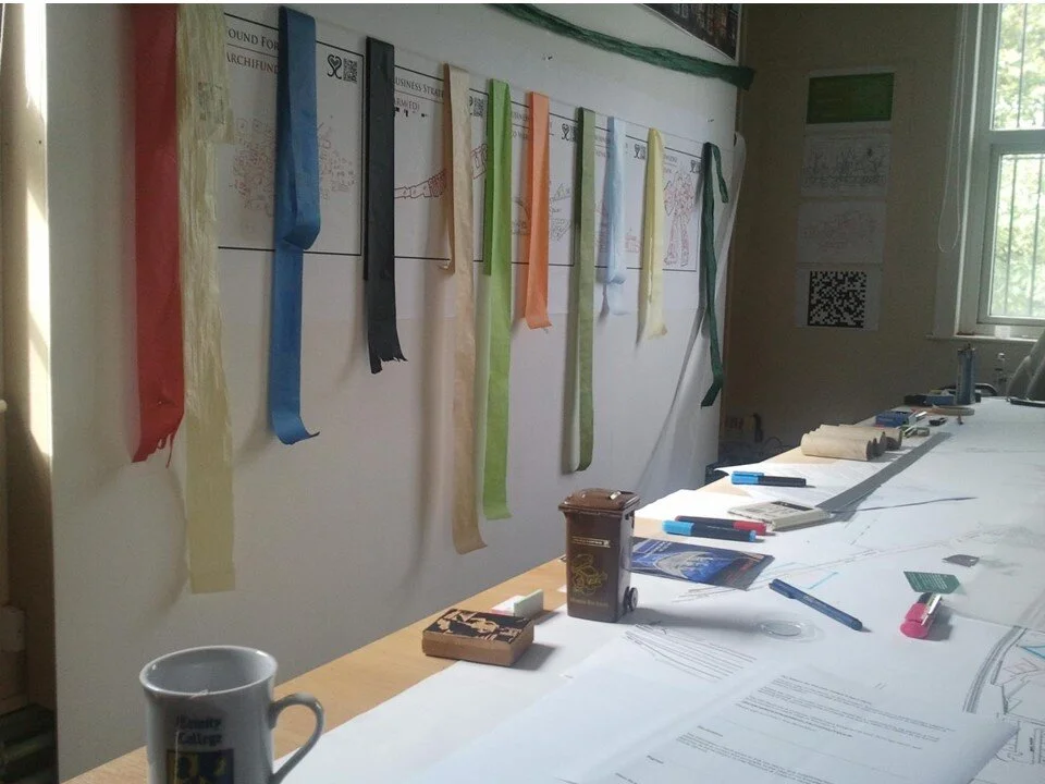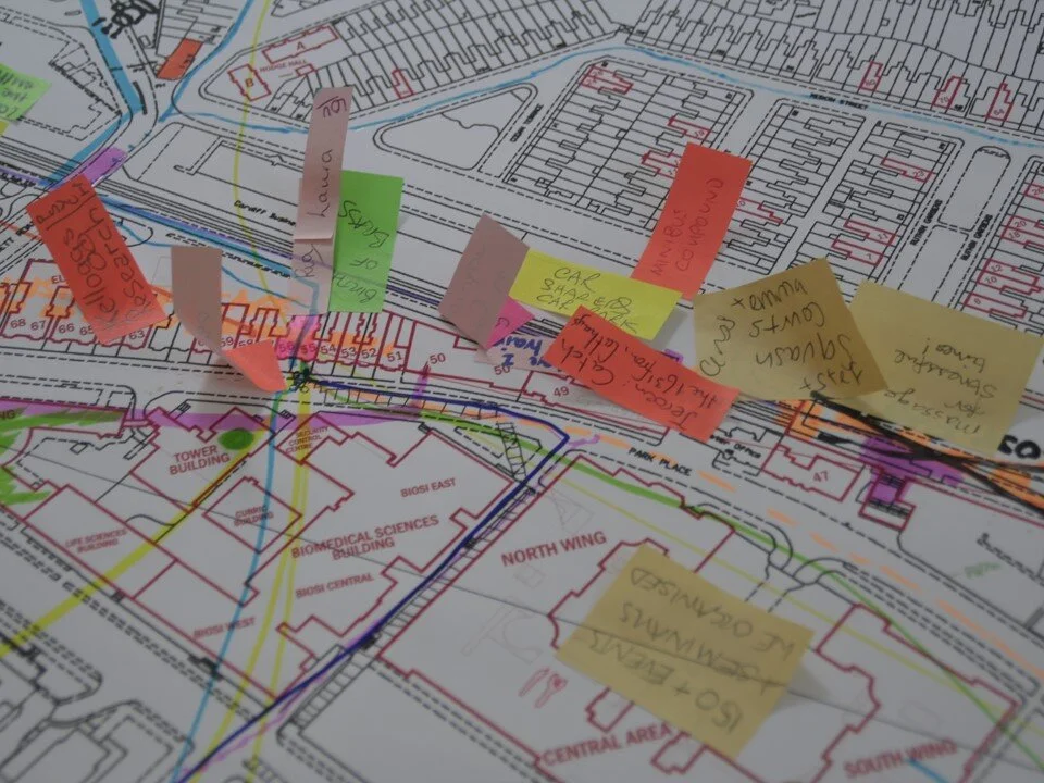 Below, a workshop engaged staff and researchers with paths in 'university life' and awareness of other departmental relationships. Notations and stories were made on the routes and connections people had created during their time in the university responding to questions from the artist. Colleagues from architecture and linguistics were also invited to participate.