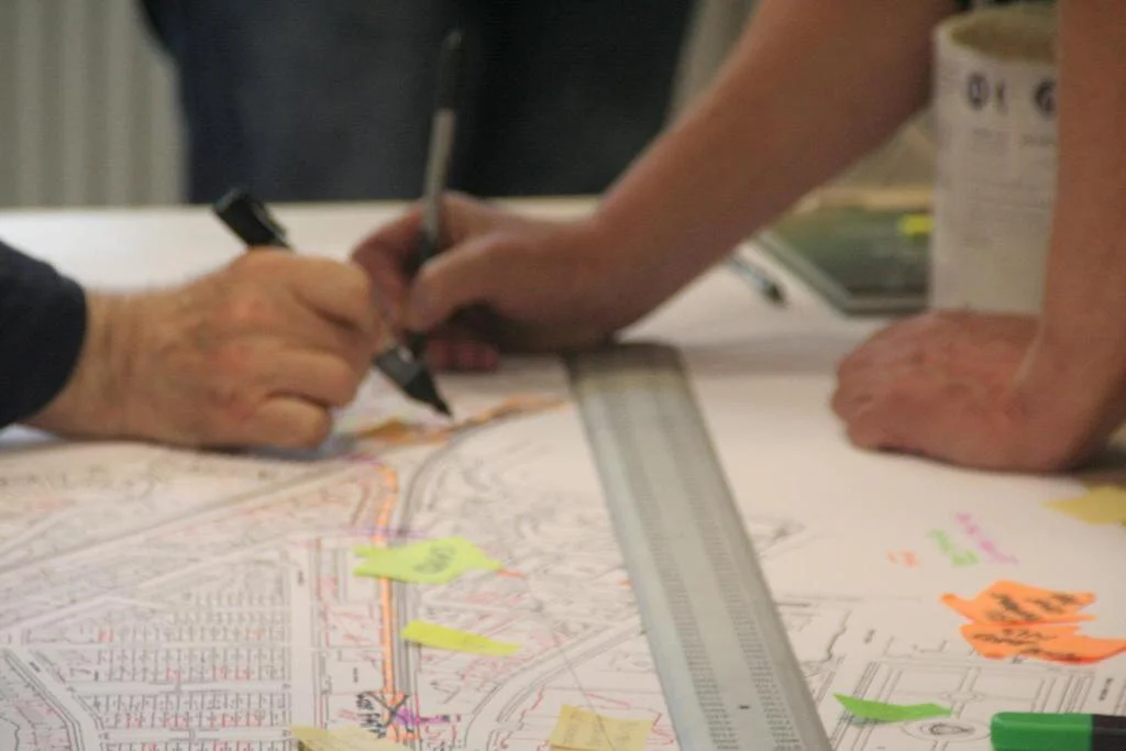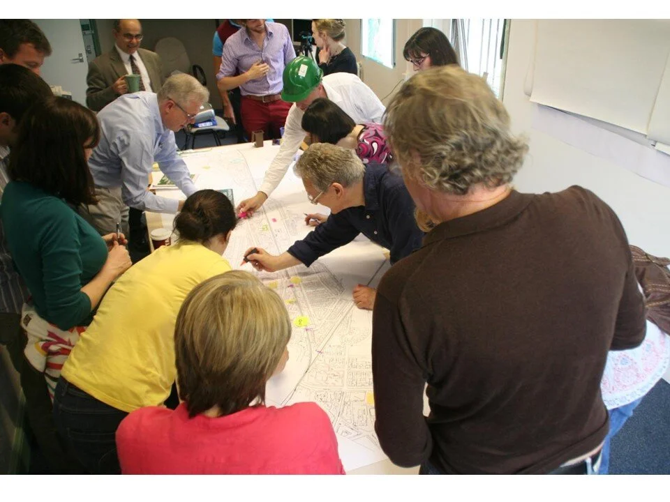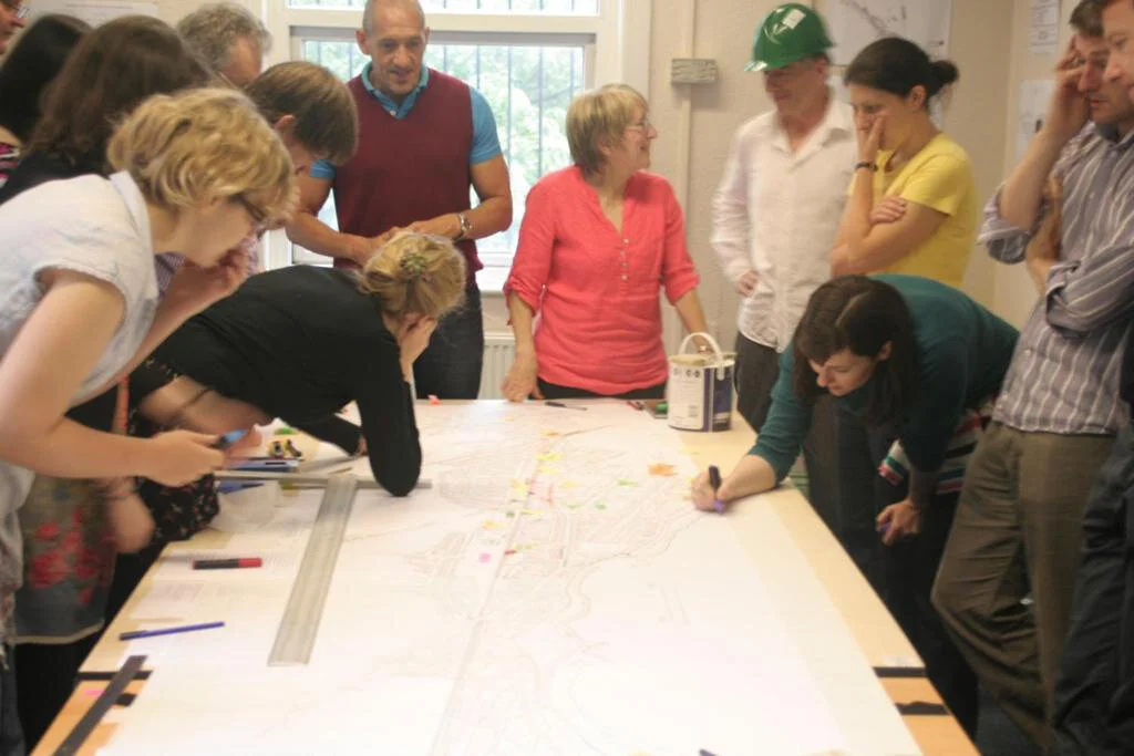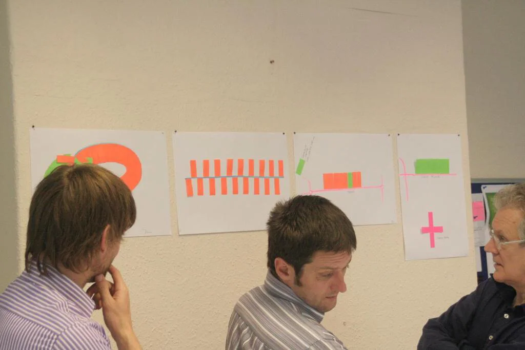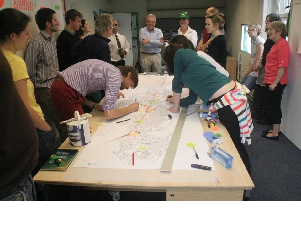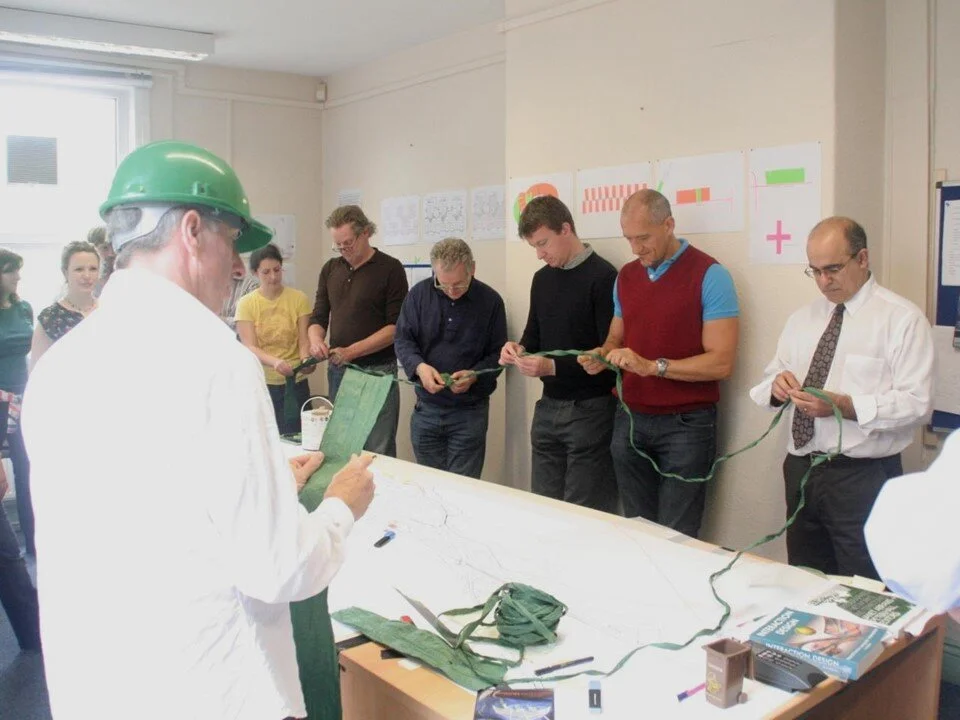 Below, a workshop engaged staff and researchers with paths in 'university life' and awareness of other departmental relationships. Notations and stories were made on the routes and connections people had created during their time in the university responding to questions from the artist. Colleagues from architecture and linguistics were also invited to participate.
