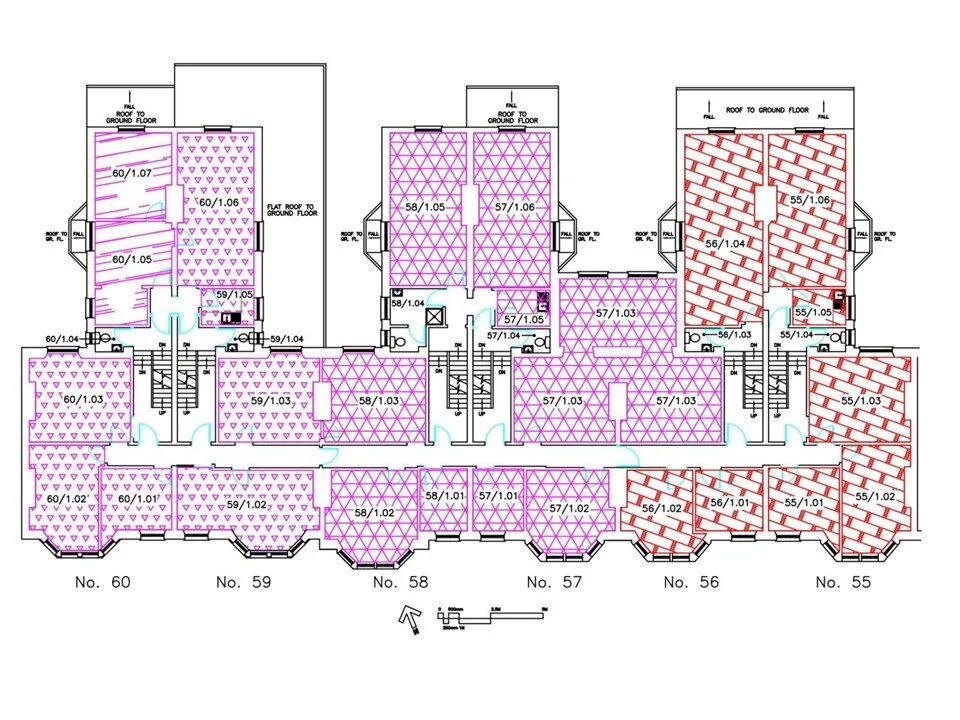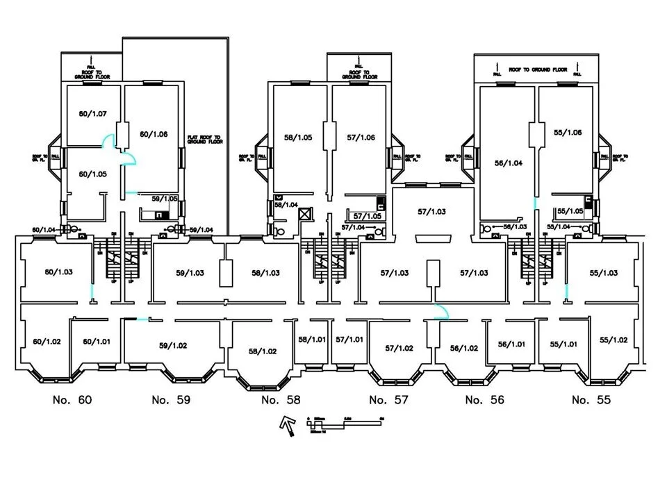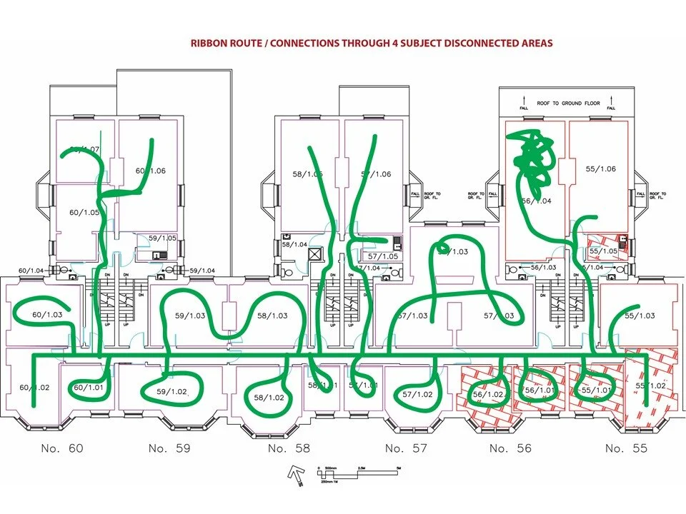 A connecting corridor has been inserted through the first floor of the terrace, building to building, apparently connecting schools and rooms. The longitudinal aperture disrupts the Victorian orthodoxy of internal space. This produces the 'bedsit effect' where rooms are disproportionately divided, thoroughfares disjointed. Movement through the space is illogical and disorientating. People tend not to speak to each other, adjacent rooms remain as though in parallel universes - knowledge silos - a deep underlying un-sustainability....