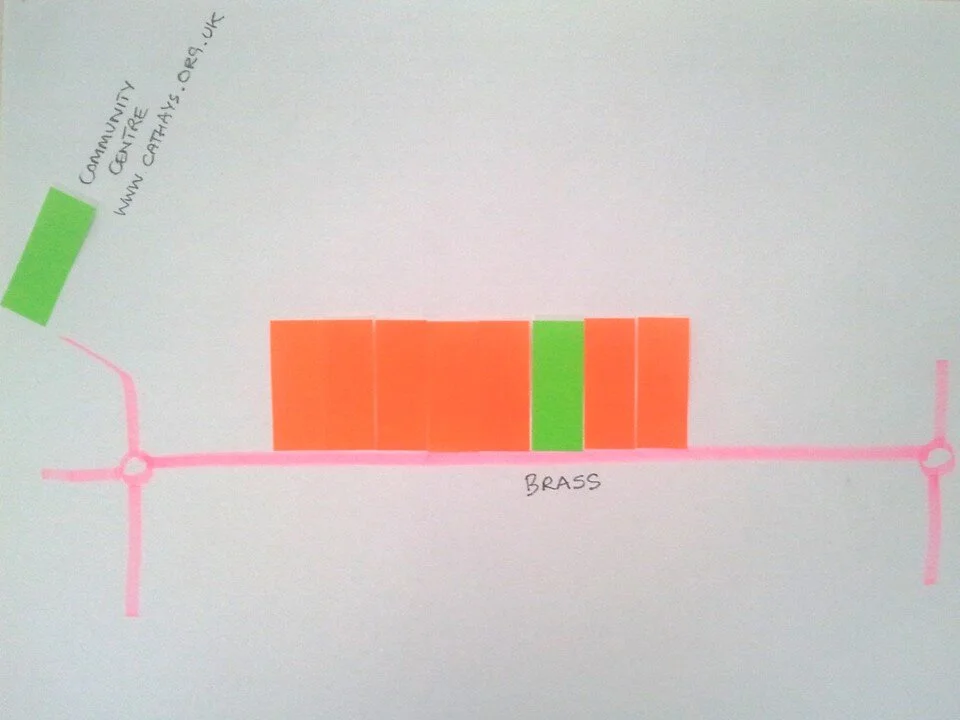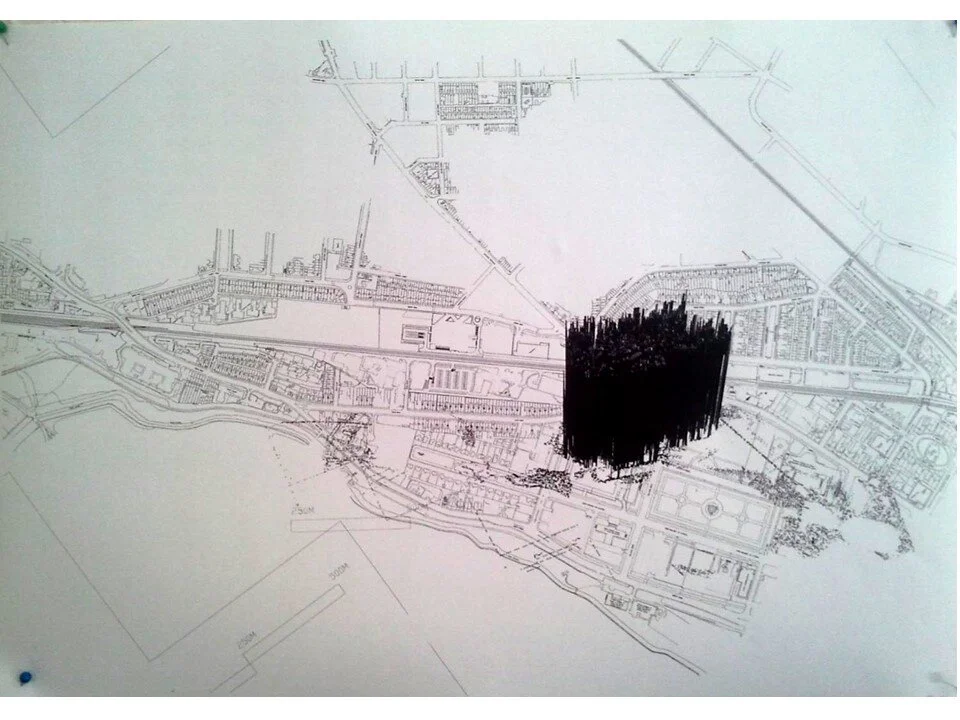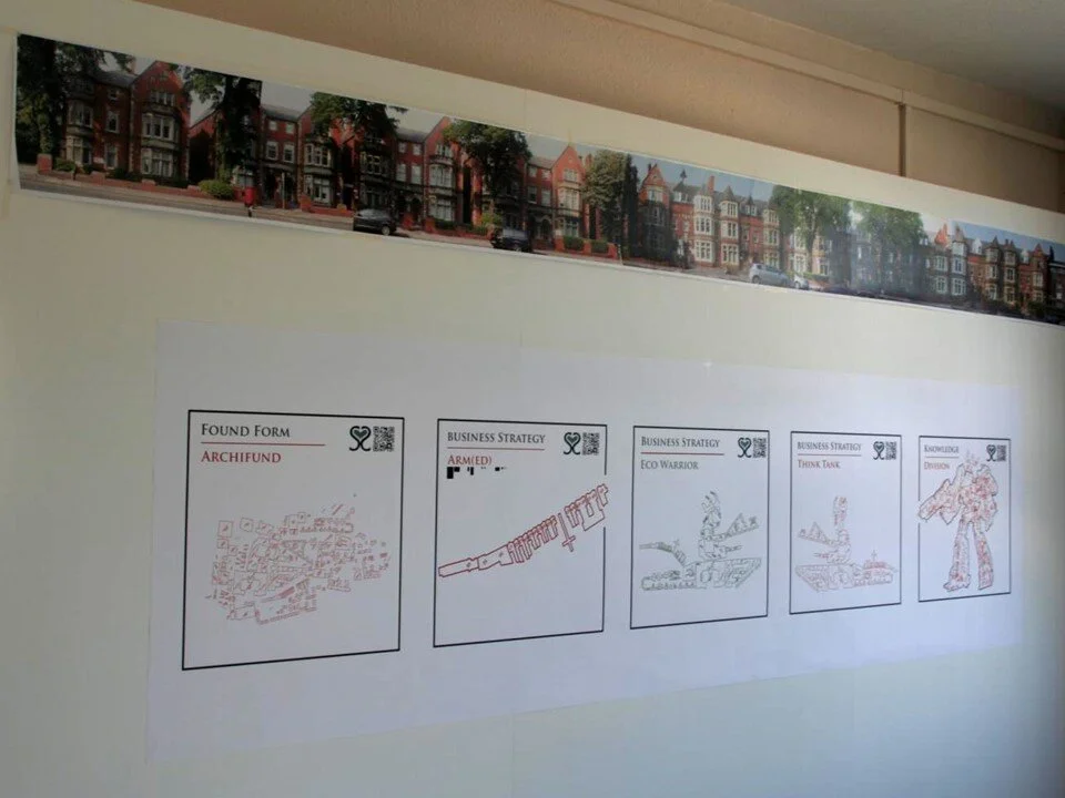 Five pictographic images "Interstitial Works" exploit the university Estates department map. They revealed an organism within the city at large. The great adventure of the work focuses down to the terrace of lofty Victorian houses, among the buildings colonised by the university over the past 50 years and home to the BRASS centre on Park Place.