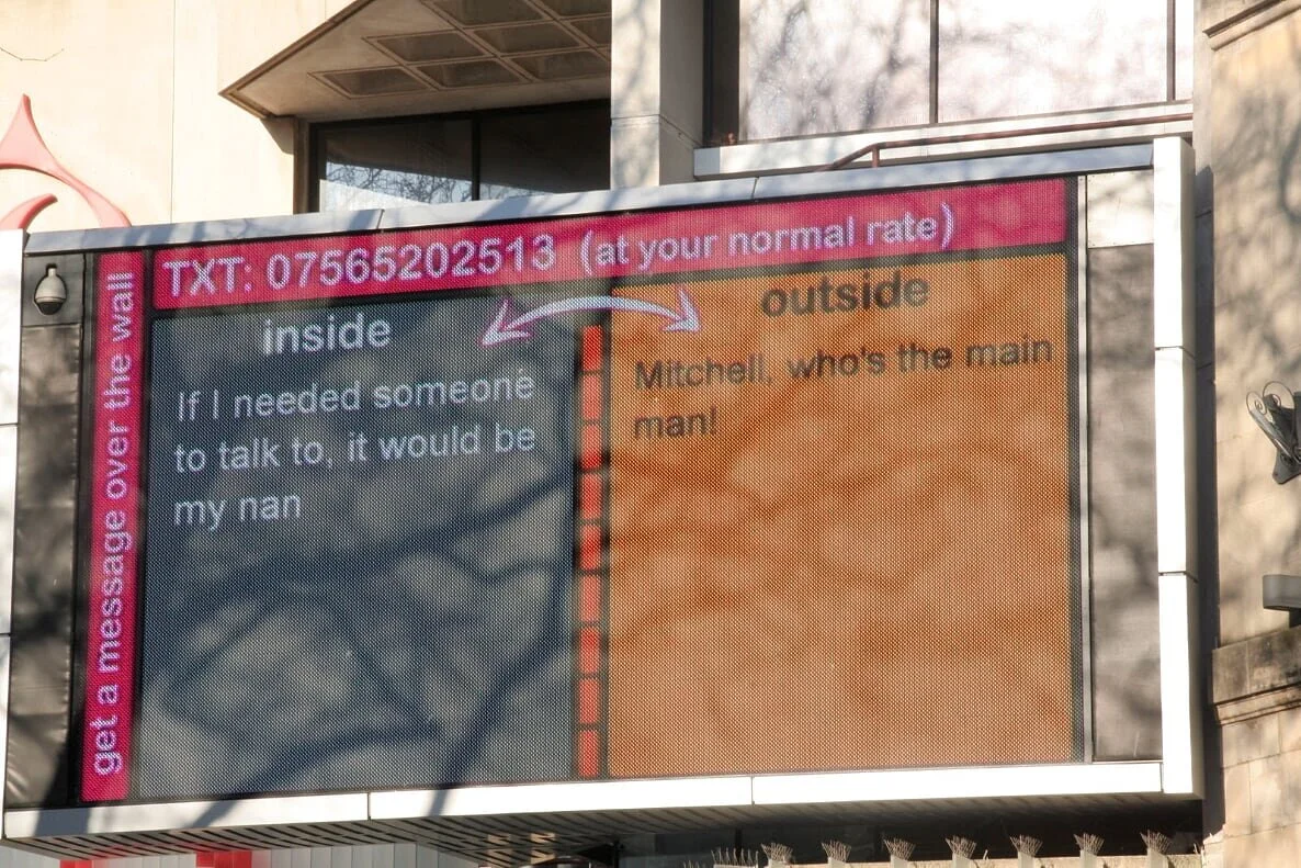 The title of the project alludes to connecting the inside and outside of a prison via the medium of text messaging as part of a broader TXT2 project by Glenn Davidson and Anne Hayes.